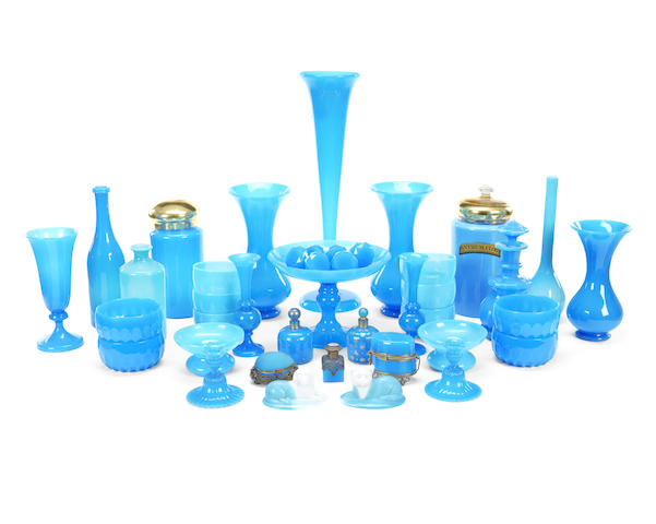 including a set of six canted door knobs, a gilt mounted rule, an oval casket, a moulded dog and cat, a large tazza, a pair of large vases, a gilt mounted oval casket, egg and scent bottle, two chemist jars with gold lids, various finger bowls, vases