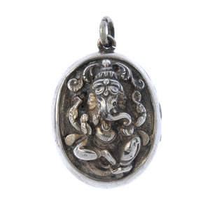 The front designed as the Hindu deity Ganesha, to the plain surmount loop and reverse, opening to reveal a glazed hair panel. Length 4.7cms. Weight 20.2gms.