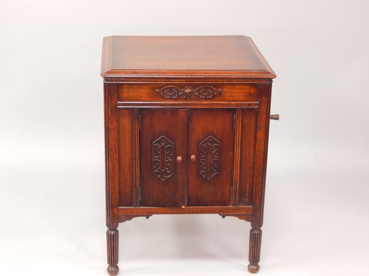 The Trings-Tone, lid opening to reveal fitted interior above two doors opening on a sunburst sound box, raised on fluted legs and bun feet
