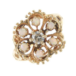Of openwork design, the brilliant-cut diamond and circular opal cabochon cluster, to the foliate surround and scrolling shoulders. Estimated diamond weight 0.20ct, J-K colour, SI clarity. Ring size Q1/2. Weight 4gms.