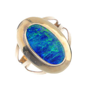 An opal doublet single-stone ring. The oval opal doublet collet, with polished surround, to the trifurcated shoulders. Ring size T. Weight 4gms.