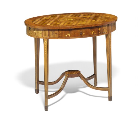 An oval Russian Louis XVI fruitwood marquetry table, apron with drawer