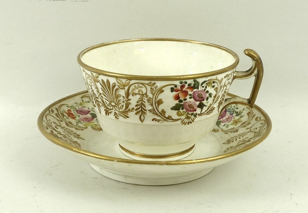 An over sized tea cup and saucer, hand painted with flowers and gilded highlights, and a part tea service