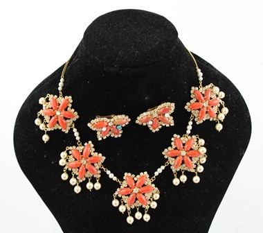 of simulated coral and pearls, comprising necklet and a pair of earrings