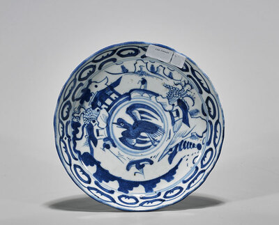 Antique Chinese blue and white porcelain dish; of shallow form; centering a bird in flight; encircled by an architectural landscape; hall mark to base; D: 6 3/4" (approx.)
