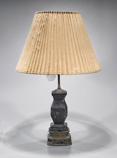 Antique Chinese carved stone vase; mounted as a lamp; comprising three sockets; the body of faceted form; the stone of black coloration with gray inclusions; resting atop a metal base; Provenance: Collection of Gabriella