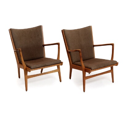 A pair of patinated oak easy chairs. Seat cushions and back upholstered with brownish wool. Model AP 16. Designed 1952. Manufactured by AP Stolen. (2)