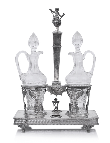 OLIERA IMPERO IN ARGENTO, PARIGI, 1810 CA., ARGENTIERE P.J.MEURICE, base rettangolare traforata su piedi, sostegno ad obelisco rovesciato cimato da amorino su sfera, cesti con cigni, cesti fioriti e foglie d'acanto; ampolle in cristallo d'epoca succe