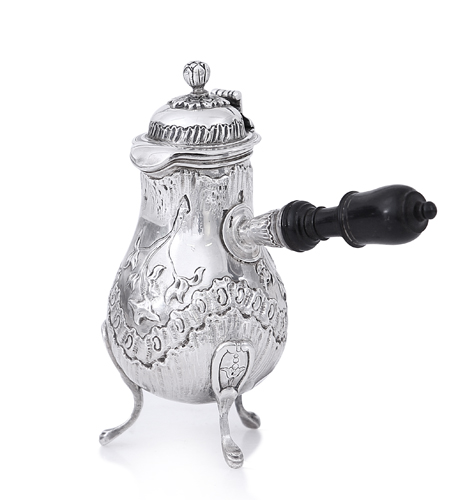 CAFFETTIERA EGOISTE IN ARGENTO, PARIGI, XVIII SECOLO, piriforme su piedini e sbalzi rocaille, manico traverso in legno. g 110