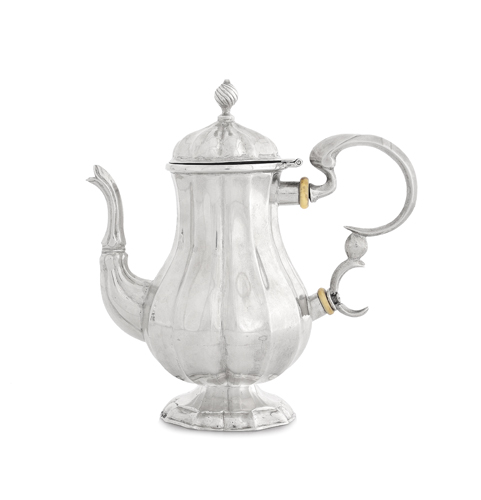 CAFFETTIERA EGOISTE IN ARGENTO, ROMA, 1828-1841, ARGENTIERE L.PAGLIARI, costolata con manico a doppia voluta, cimatura a sfera baccellata. g 360