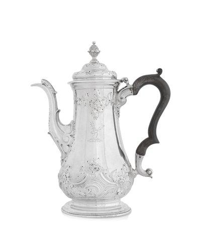 CAFFETTIERA GIORGIO II IN ARGENTO, LONDRA, 1759, ARGENTIERE F.WHITE, piriforme sbalzata a fiori e volute, manico in legno. g 700