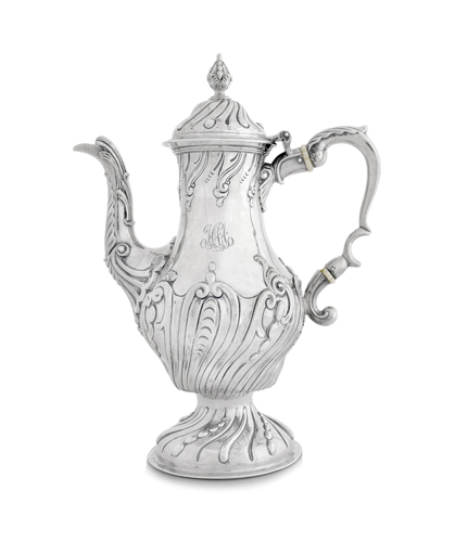 CAFFETTIERA GIORGIO III IN ARGENTO, LONDRA, 1763, ARGENTIERE S.COURTAULD, piriforme sbalzata con manico a voluta; difetti. g 1020