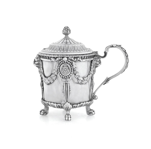 MOSTARDIERA IN ARGENTO, PARIGI, MAISON ODIOT, 1870 CA., ad un manico con piedi ferini, decori a festoni e testa di leone, bordi perlinati e cimatura a pigna, vetro blu interno. g 250