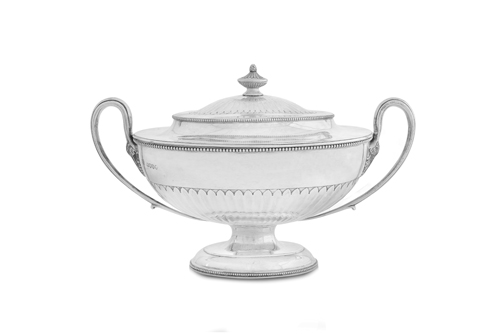 ZUPPIERA CON COPERCHIO IN ARGENTO, LONDRA, 1885, ovale a due manici, bordi perlinati e fascia con nervature; lievi difetti. g 990, 32x18 cm h 16,7.
