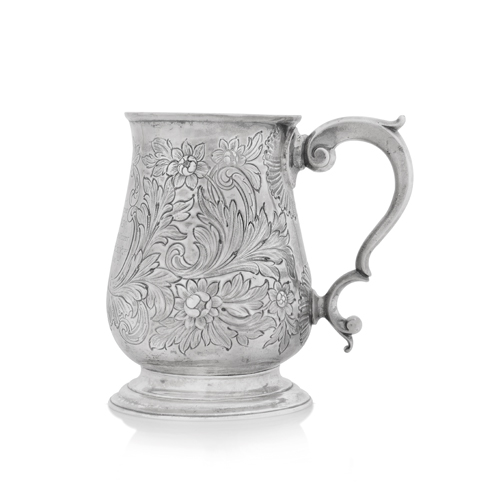 MUG GIORGIO III IN ARGENTO, LONDRA, 1764, ARGENTIERE W.CRIPPS, sbalzato con decoro floreale e manico a voluta. g 340