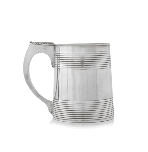 MUG GIORGIO III IN ARGENTO, LONDRA, 1782, ARGENTIERI A.FOBELBERG & S.GILBERT, liscio con scanalature orizzontali e manico a voluta. g 380
