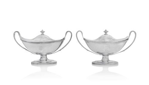 COPPIA DI SALSIERE CON COPERCHIO GIORGIO III IN ARGENTO, LONDRA, 1795, ARGENTIERI J.& E. BLAND, ovali a due manici con bordi scanalati e cresta incisa. g 1020, larg. 23,5 cm