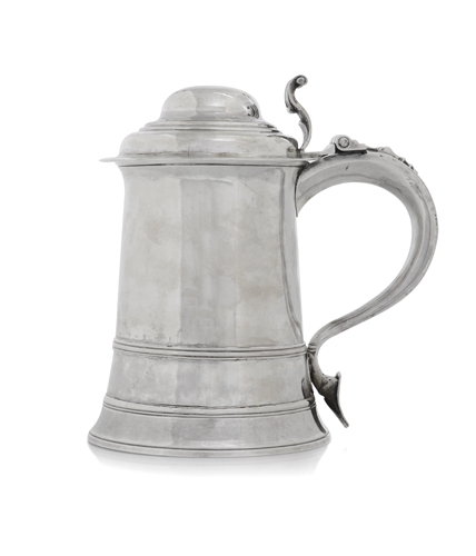 TANKARD GIORGIO III IN ARGENTO, LONDRA, 1765, ARGENTIERE W.SHAW, corpo troncoconico liscio con coperchio incernierato, manico a voluta e bordo gradinato. g 750