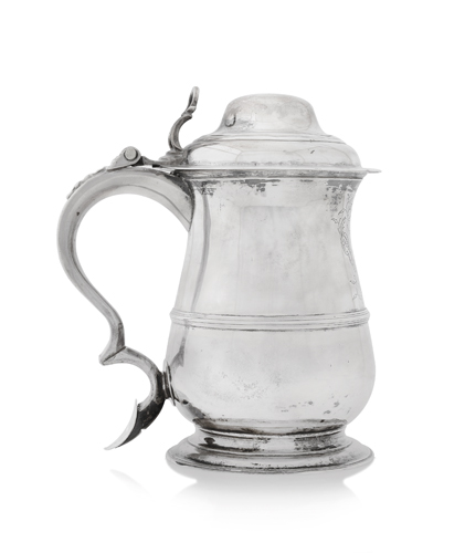 TANKARD GIORGIO II IN ARGENTO, LONDRA, 1759, ARGENTIERI W.SHAW & W.PRIEST, liscio con coperchio bombato incernierato e manico a voluta; monogramma entro cartiglio inciso; lievi difetti. g 740