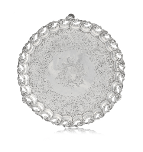 SALVER GIORGIO II IN ARGENTO, LONDRA, 1754, circolare con bordo a meandri e piedini a volute, piano inciso centrato da stemma. g 1010 diam. 31 cm