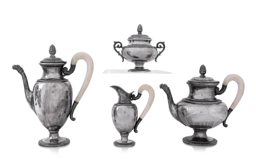 SERVIZIO DA TE' E CAFFE' IN ARGENTO E AVORIO, XX SECOLO, in stile Impero composto da caffettiera, teiera, lattiera e zuccheriera con coperchio, ammaccatura. g 2580