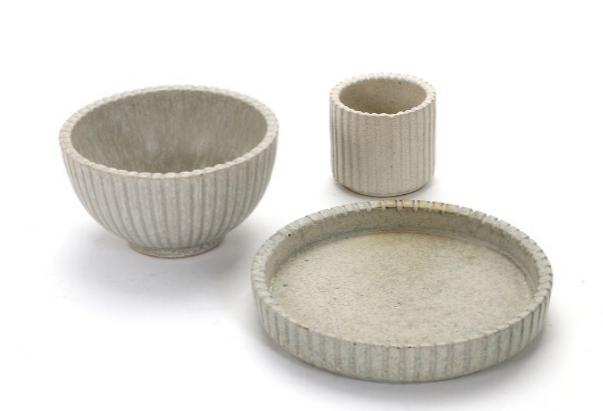 Modelled with vertical, fluted pattern and decorated with greyish white glaze with some blue elements. All signed monogram. Dish: H. 2,5 cm. Diam. 16,5 cm. Bowl: Numbered 118. H. 7 cm. Diam. 12,6 cm. Small cylindrical bowl: Numbered 128. H. 5,7 cm. D