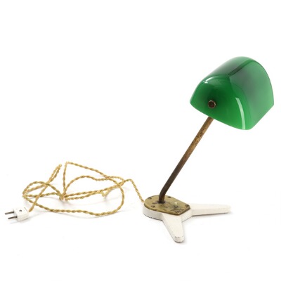 A desk lamp with white lacquered base and brass stem, green glass shade.
