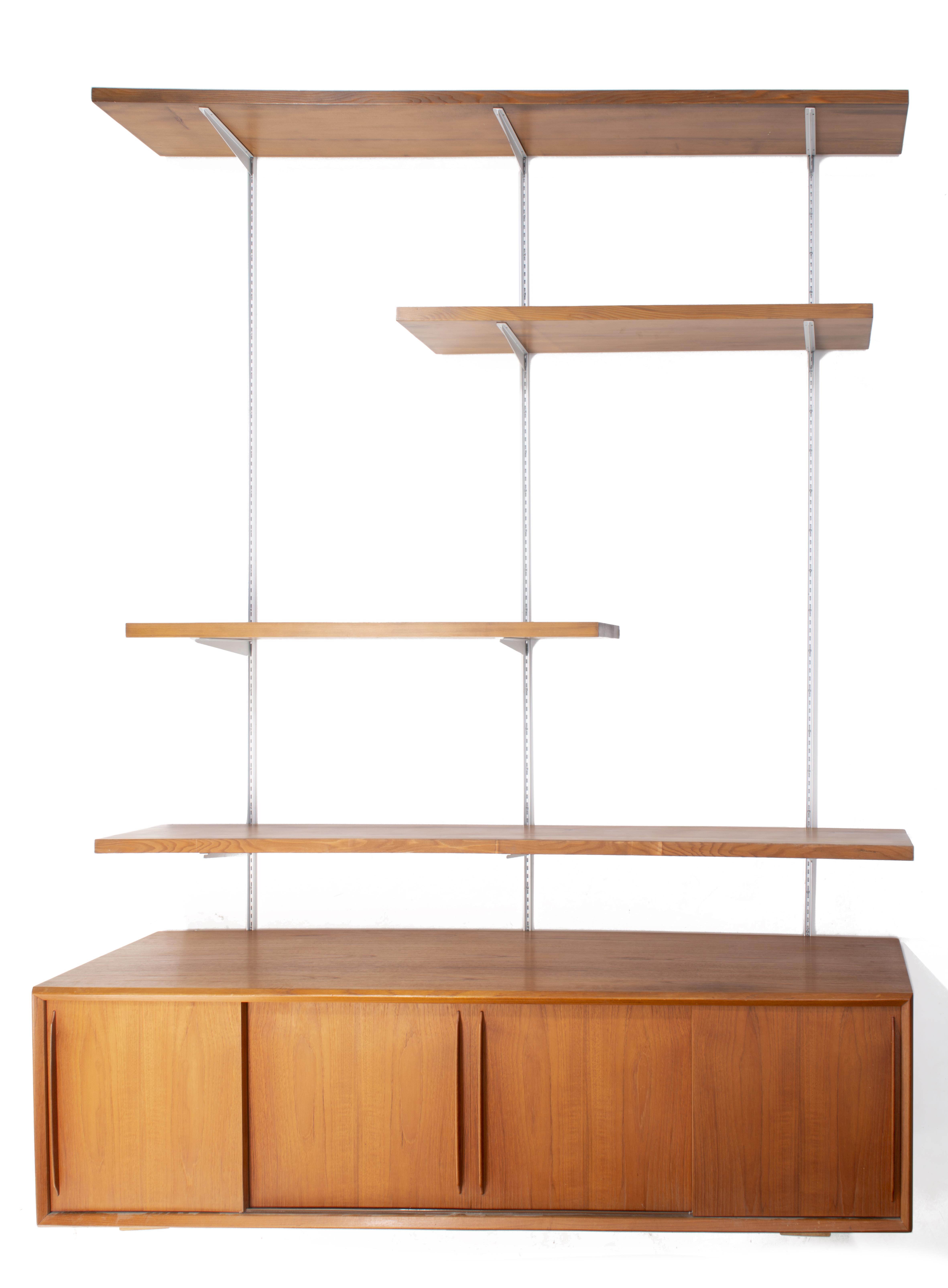 Arne Vodder, attribué à, H. P. Hansen Denmark, enfilade bombée en palissandre ouvrant à 4 portes coulissantes, le tout accompagné de 4 étagères.
