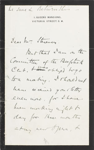 Autograph Letter Signed ("Arthur Sullivan"), 4 pp recto and verso, 8vo (conjoined leaves), 1 p, Queen's Mansions, [London], November 12, 1882, to Mrs.[?] Stevenson, on personal mourning stationery, traces of mount to last page affecting 2 letters.