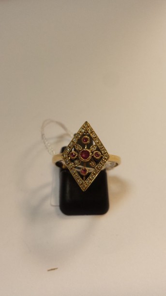 Bague en alliage d'or 9K de forme losangique à décor floral enrichi de rubis entre des lignes de diamants en pavage