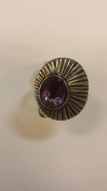 Bague en argent centrée d'une améthyste ovale facettée dans un décor rayonnant