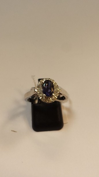 Bague en argent centrée d'une tanzanite dans un entourage de pierres blanches
