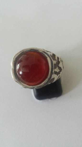 Bague en argent ornée d'une cornaline cabochon dans une entourage de motifs finement travaillés.