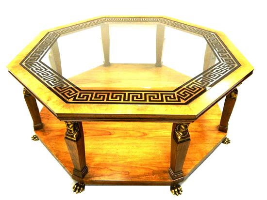 mahogany, octagonal form, bronzed figural busts depicting Greek female along top of each mount, removable glass top with black painted Greek design along perimeter, raised on eight bronzed hairy paw feet, expected surface wear including scratching, s