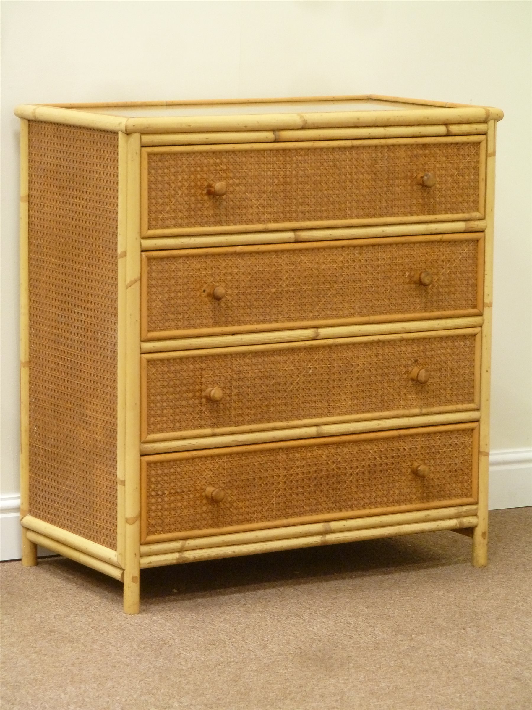 Bamboo and cane chest fitted with four long drawers and inset glass top