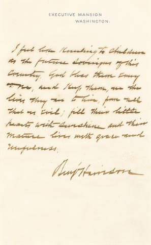 Autograph Manuscript Signed ("Benj Harrison") as President, 1 p, 8vo, Washington, c.1891, in brown ink, on Executive Mansion stationery, mild toning. Matted and framed.