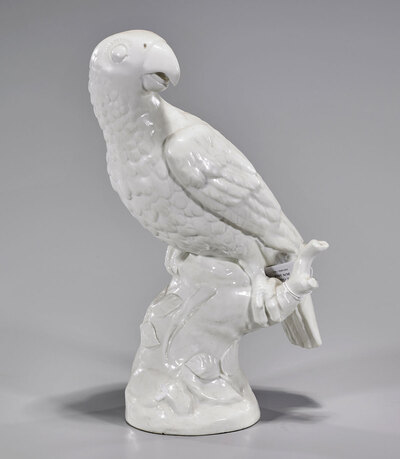Blanc de chine porcelain parrot; perched atop a branch, with head turned towards the left; Provenance: Collection of Gabriella "Kay" Robertson of Loewi-Robertson Inc.; H: 13 1/2" (approx.)