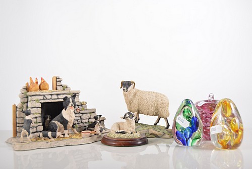 Border Fine Arts model, Cottage Fireplace, on a wooden plinth, 23cm, two other similar models of Sheep and three glass paperweights (6).