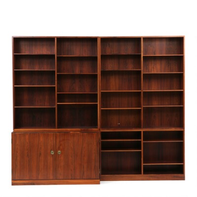 Wall unit of rosewood, consisting of cabinet and three bookcases