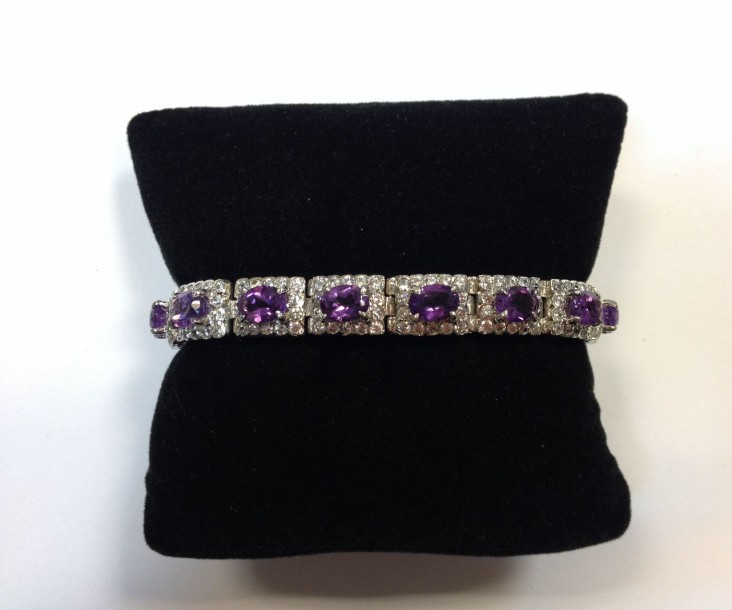 Bracelet ligne en métal centrée de motifs rectangulaires ornés d'améthystes ovales facettéess serties sur griffes dans un pavage
