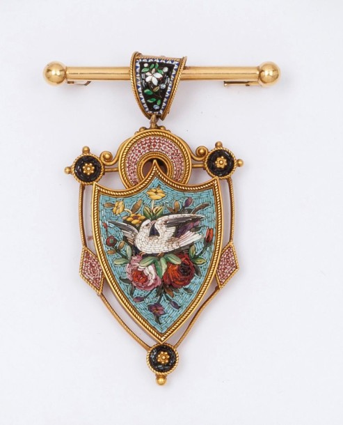 Brooch in yellow gold and micro-mosaic decorated with a dove and a bouquet of flowers. XIXth century. P. 15.2 g.