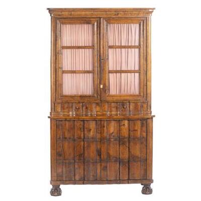 Buffet Italian credence 2 Baroque Eighteenth low part with 2 doors simulating 3 drawers on claw feet, upper part with 2 drawers and 2 glass doors. Walnut loupe plating.