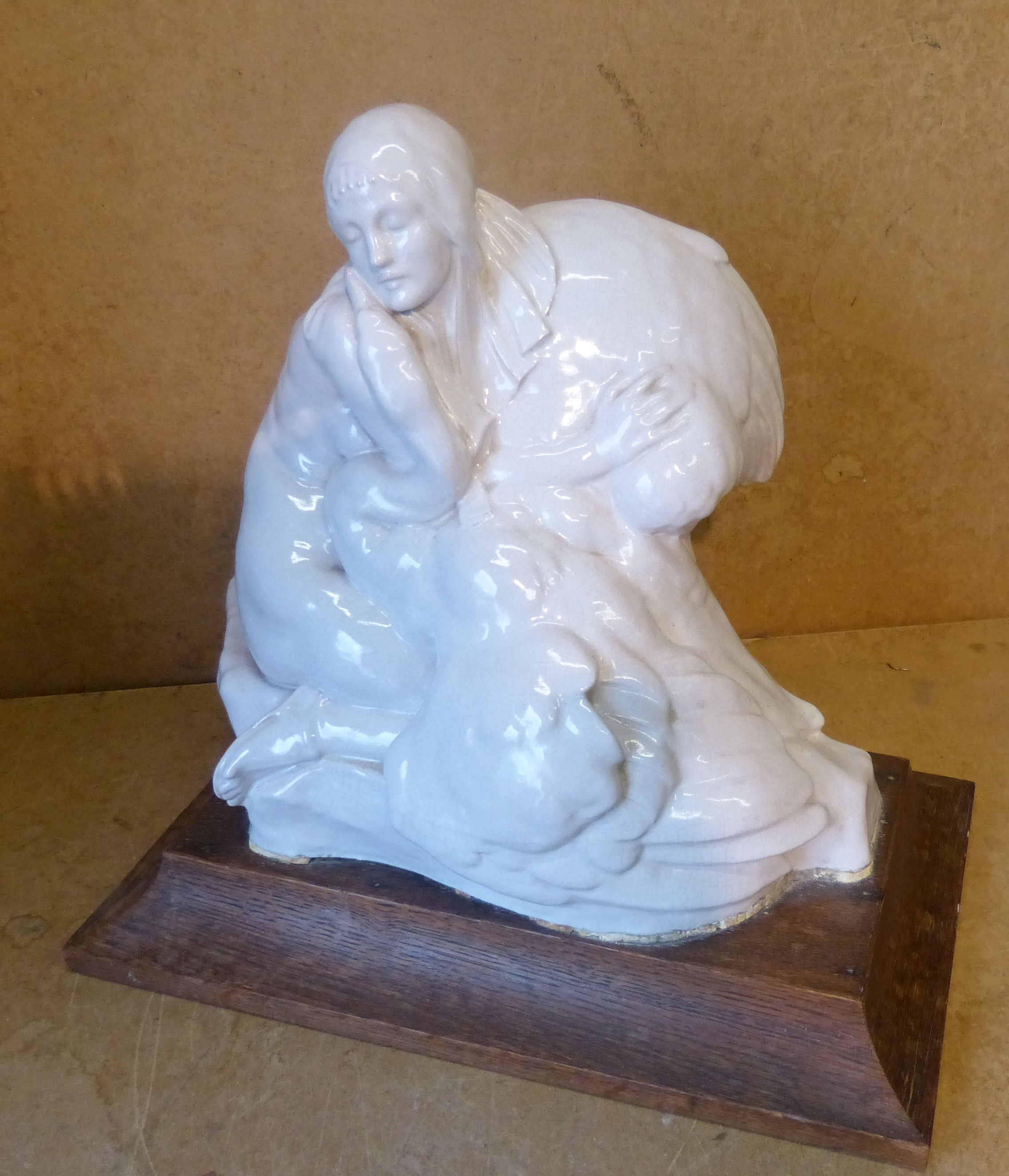 Cabb Early 20th Century White Glazed Group of a seated female nude holding a swan, indistinctly signed to reverse on oak rectang, early 20th century