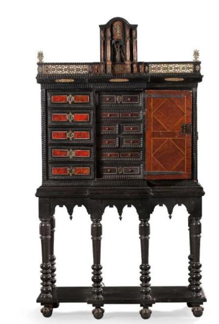 Cabinet inlaid with ebony and red-tinted scale, underlined with bone nets; Of architectural form, the covering has a perforated balustrade, centered around a peristyle surrounding a niche decorated with a statue of Minerva; The lower part opens by te