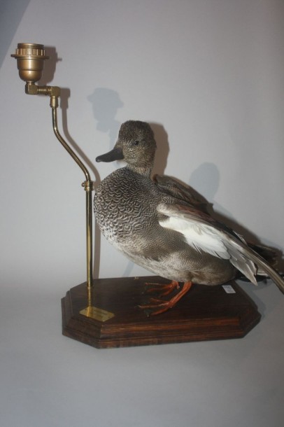 Canard naturalisé, les ailes semi-déployées, monté en lampe sur un socle moderne.