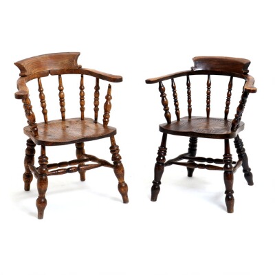 Two stained beech and elm armchairs with solid seats in one piece
