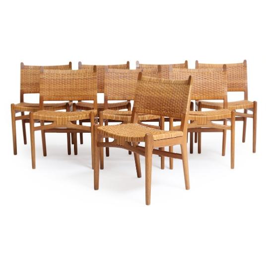 "CH 31". A set of eight oak chairs, seat and back with woven cane.