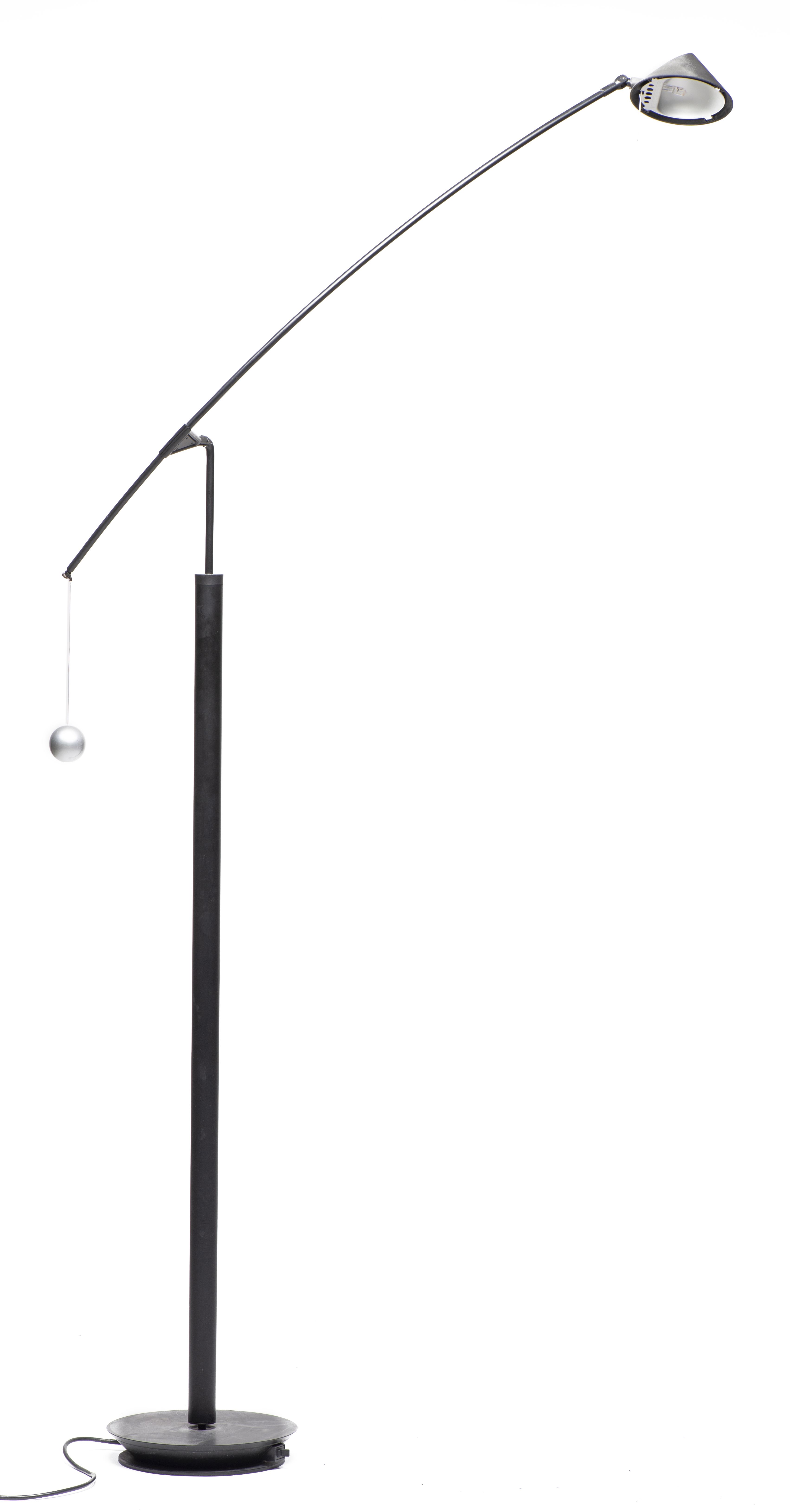 Lampadaire en métal laqué noir et plastique. Bille de métal contrepoids laqué en gris