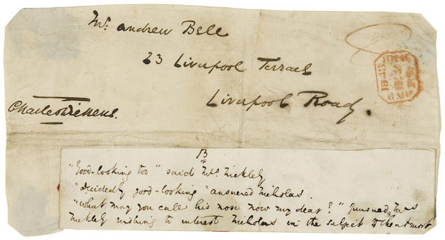 Autograph Manuscript with Signature ("Charles Dickens"), 4 lines from Nicholas Nickleby, on strip of paper affixed to an autograph address leaf with 1843 postmark, [London, summer 1839], pale spots from sealing wax and minor smudging. Matted and fram