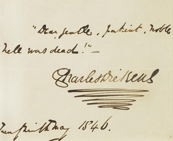 Autograph Quotation Signed ("Charles Dickens"), from The Old Curiosity Shop, 4 lines, oblong 12mo, n.p., May 29, 1846, horizontal fold. Matted and framed with portrait.